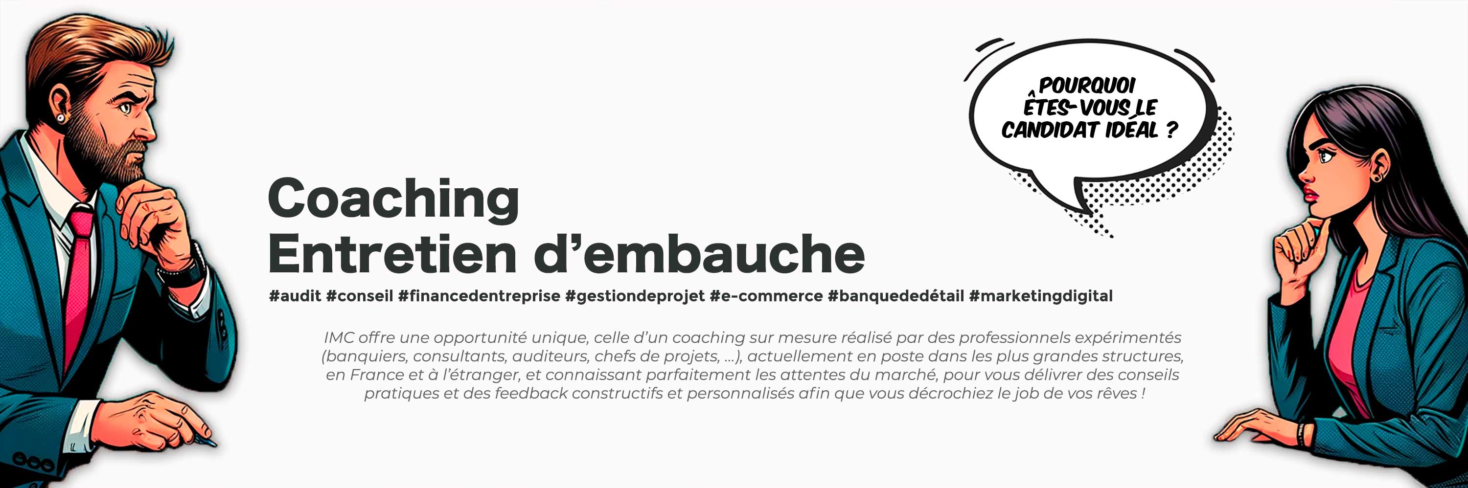 Bienvenue sur Interview Master Coach, la plateforme dédiée à votre succès en entretien d'embauche. Nos coachs sont tous des professionnels expérimentés, habitués à faire passer plusieurs dizaines d'entretiens d'embauche par an dans leurs entreprises respectives (Big 4, grandes banques, entreprises du CAC40, ...). Nous proposons des sessions d'entraînement personnalisées pour vous préparer au mieux aux conditions réelles des entretiens. Chez IMC, apprenez à maîtriser l'art de l'entretien, à valoriser votre parcours et à faire la différence. Réservez dès maintenant votre session et faites le premier pas vers la réussite de votre carrière.